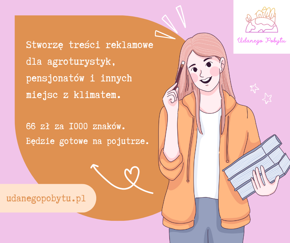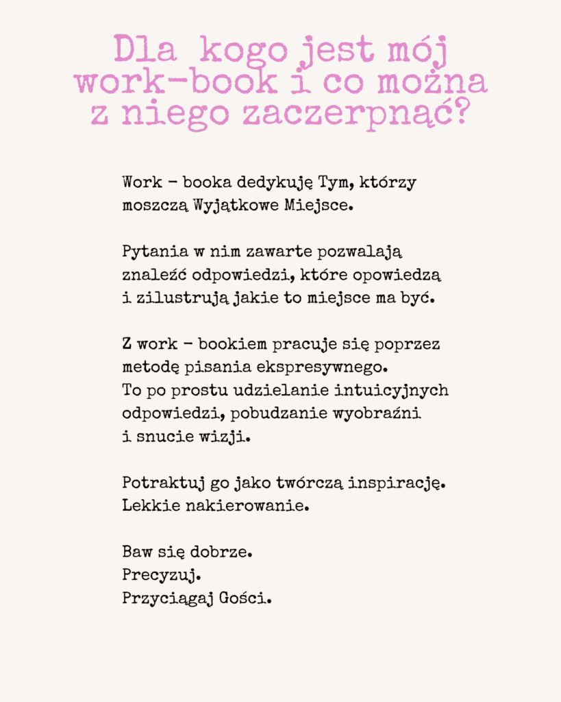 Systematycznie poszerzaj swoją wiedzę na temat tego, jak jeszcze możesz zadbać o wizerunek i komunikację swojej marki. W jaki sposób możesz to zrobić? Na przykład pracując z stworzonym przeze mnie work-bookiem MARKETING DLA OBIEKTÓW Z DALA OD ZGIEŁKU, który znajdziesz tutaj.